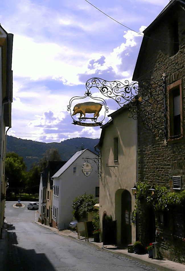 Op de terugweg kom ik door Senheim zelf, mijn aandacht word getrokken door een gouden varken (Schwein) dat in de lucht hangt. Het restaurant wat hierbij hoort heet ‘Schinkenkeller’, wat zoiets als hamkelder betekent. Iets te vrij vertaald zou je ook ‘zwijnenstal’ kunnen denken 😉