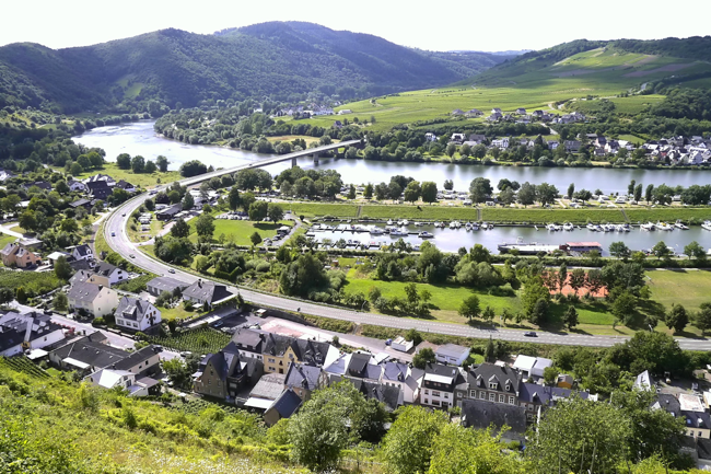 Uitzicht op de haven en de camping bij Senheim, met de Moezel in het midden.