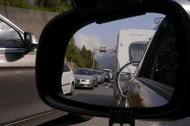 De Feeling in z’n element, achter de Suzi, in de file voor de Gotthardtunnel.