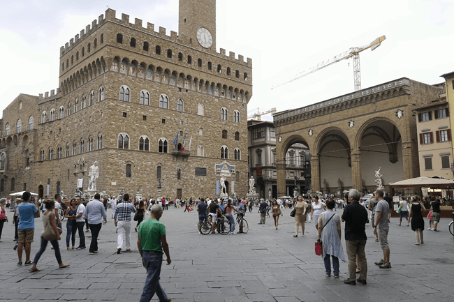 Palazzo Vecchio, de plaats waar de Medici hun macht heel wat jaartjes uitgeoefend hebben, en daarbij kunst heel veel gestimuleerd hebben. Bij toeval staat ‘David’ ongeveer in het midden van deze foto. Een copy althans.