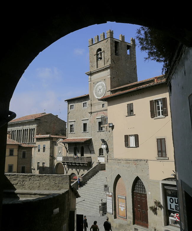 Net voor 10en was ik in Cortona, maar een 45 minuten rijden van Arezzo via provinciale wegen. Leek het voordat ik in Cortona was nog een grauwe dag te worden, eenmaal boven in Cortona deed de zon zijn best weer. Cortona is gebouwd voor klimgeiten. Vorige keer was ik min of meer alleen in de hoofdstraat (Via Nazionale) geweest, hetgeen al een behoorlijke klim vanaf de stadsrand en de parkeerplaatsen af is.