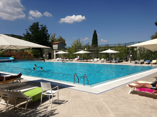 Na een uurtje of 2 rijden was ik er, en, best een mooie camping. Moest ook wel, in het hoofdseizoen betaal je hier al gauw € 70 per overnachting. Maar dan heb je ook 3 zwembaden gevuld met ongezuiverd bronwater met een constante temperatuur van 24 graden, Wifi, ruime plekken ( voor italiaanse begrippen) etc. Nu € 30 euro, en blijf ik 7 dagen, dan betaal ik er 6, waarmee de prijs per nacht op € 25 komt.