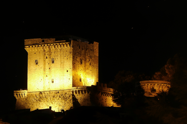 Castello van Sarteano bij nacht. Weet niet of het te zien is, rechts boven, wit streepje. Een ster, maar door de belichtingstijd van 20 seconden en het draaien van de aarde, word een stip een streepje.