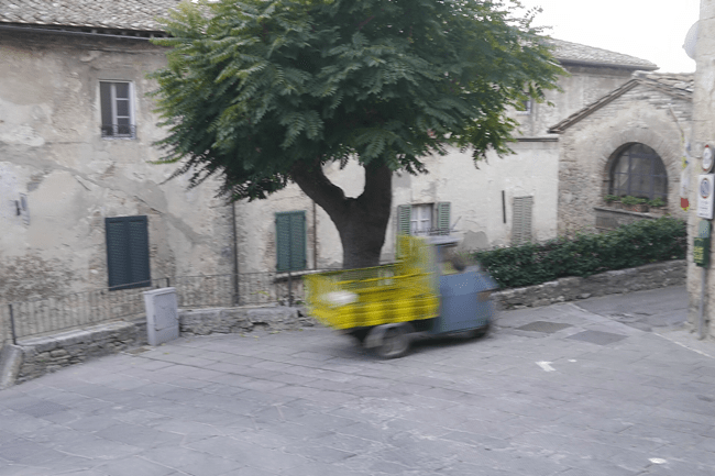 Ook in het rustige Sarteano raast het leven je soms voorbij. Wegpiraten, apen (voertuig heet Ape).