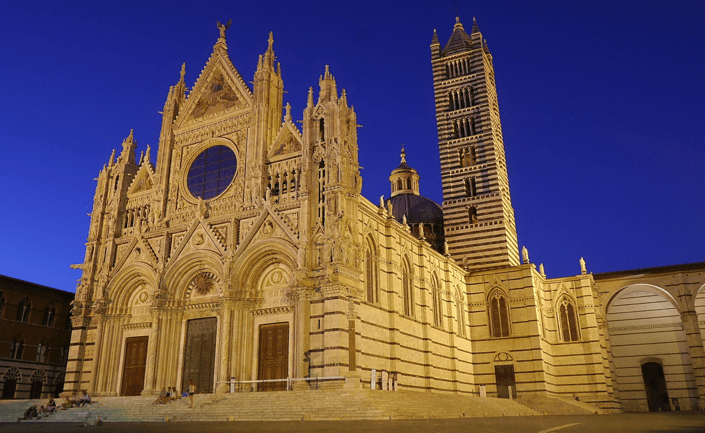 Overdag is die vooral wit, maar ‘s-avonds goudkleurig is ook wel apart. Duomo, de kathedraal van Siena.