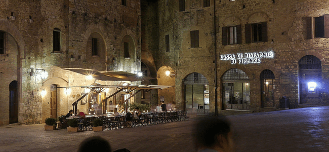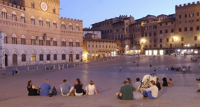 Piazza del Campo ‘s-avonds. De rode stenen voelen aangenaam warm van de hele dag zon.