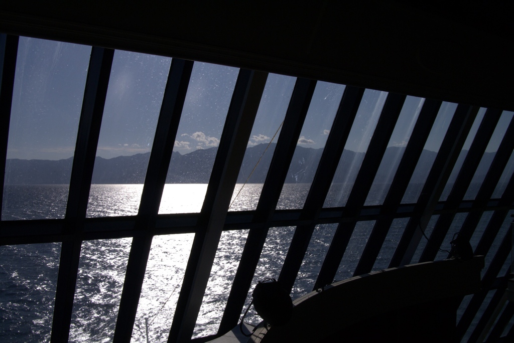 Silhouet van Corsica door de gigantische ruiten aan de voorkant van het schip.
