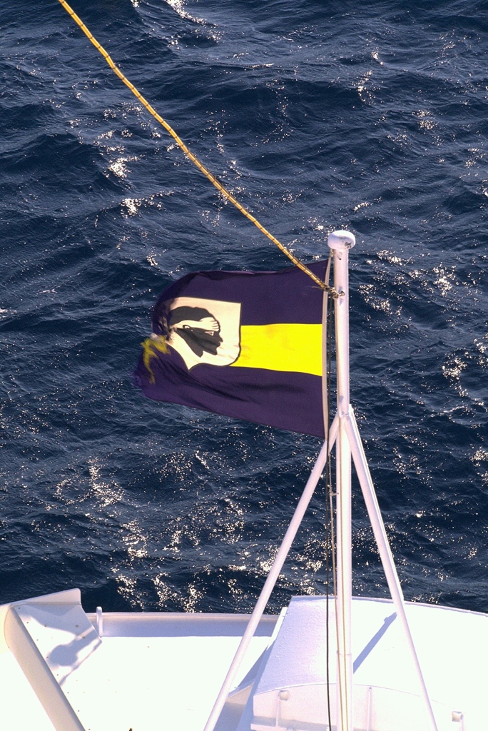 Met de Corsicaanse vlag voorop voeren we richting Bastia. (Op het moment van de foto lagen we stil, te wachten op de loods, maar stil liggen dat bekt niet echt. Vandaar ‘voeren’.)