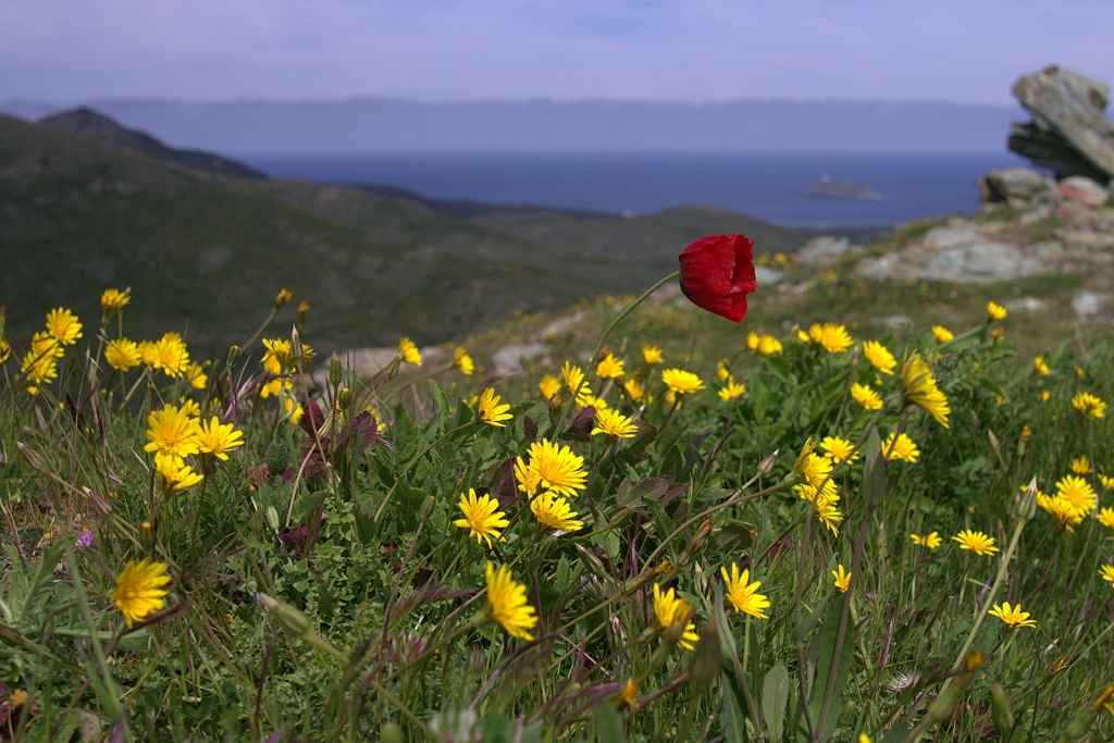 De wegen waren goed te doen, erg rustig, de maquis, of hoe dat ook heet (de lage begroeïng waarmee het eiland grotendeels overdekt is) begon al te bloeien. Op een aantal plaatsen ben ik even gestop om foto’s te maken. het zijn allemaal geen publiekstrekkers, maar ik heb er van genoten vandaag.