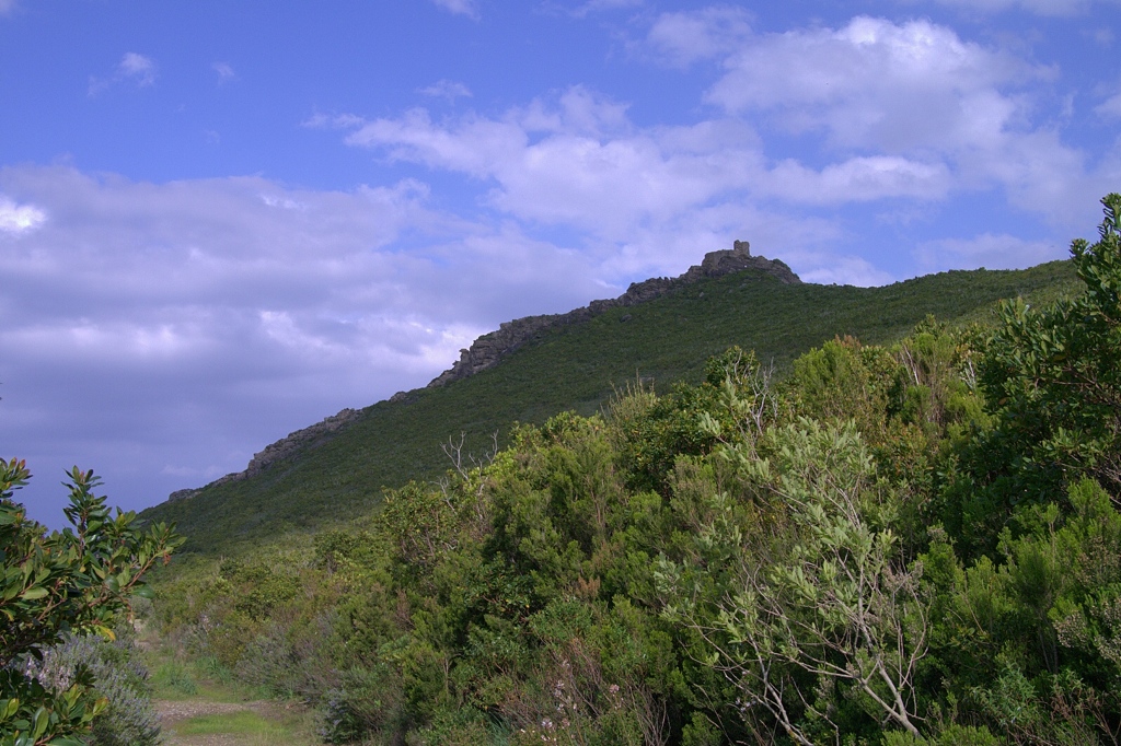 Na een tijdje het ‘pad’ door de maques gevolgt te hebben, m’n broek ruikt nu heerlijk naar de maques, kwamen we op een gewoon pad, maar nadat het pad door de maques me enigszins in de goede richting bracht, liep dit pad vooral evenwijdig aan de ‘berg’ en dus niet omhoog.