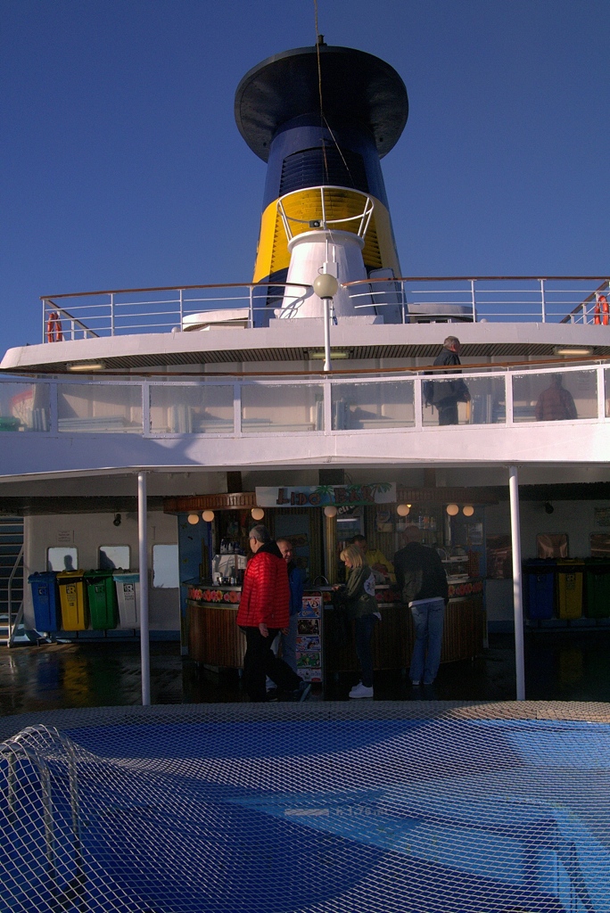 Boven in waren allerlei ruimtes, restaurent, cafe’s etc waar iedereen gedurende de oversteek plaats kon nemen. Voor de zonliefhebbers waren er op het achterdek ligstoelen en er was zelfs een open bar op het achterschip. De oversteek duurt ruim 4 uur, dus je moet wel wat te doen hebben.