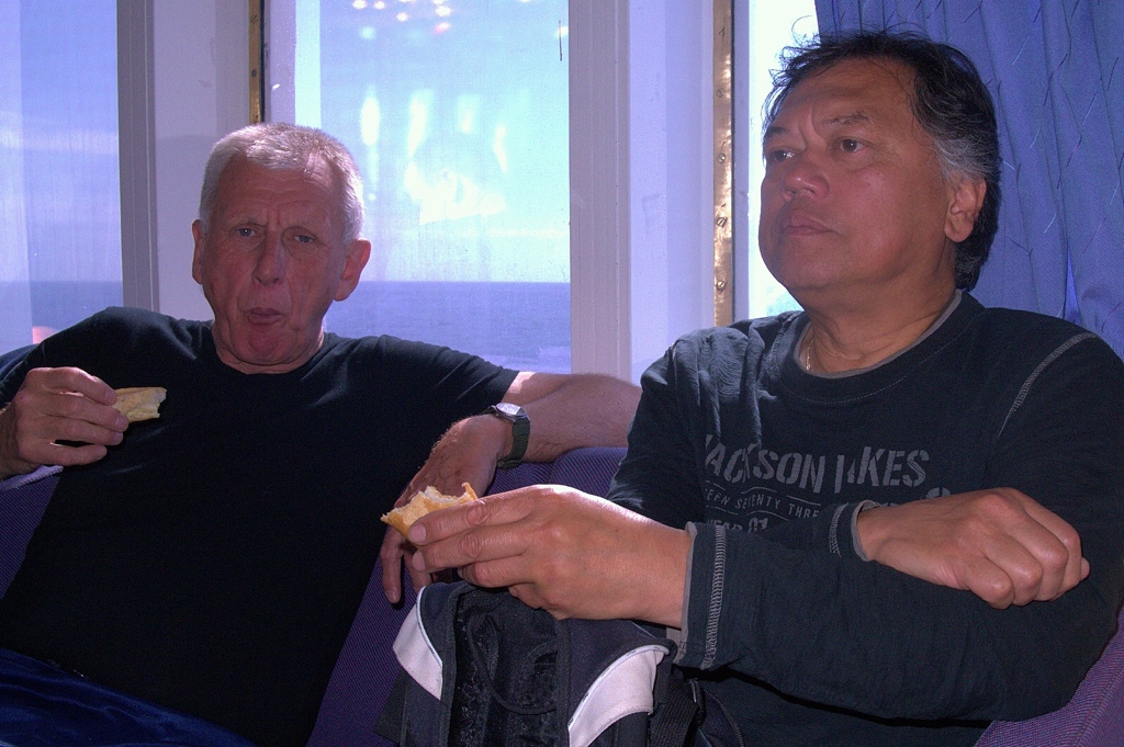 Zelf vond ik een plekje in de muziek/danszaal uitkijkend over het voorschip. Vrij snel na het vertrek kwam ik in contact met 2 nederlandse motorrijders. Voor het vertrek, toen we nog in de rij stonden voor het inschepen, had ik hun motoren al gezien en bekeken. Een BMW GS 1200 en een BMW 800 Adventure. De laatste viel bij mij wel in de smaak.