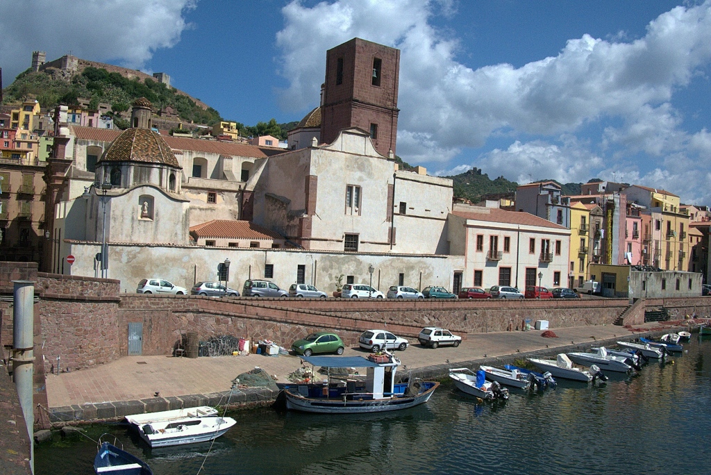 Aan de onderkant, bijna Utrechtse gracht, de aanlegplaats voor de vissersboten. In het midden één van de vele kerken van Bosa.