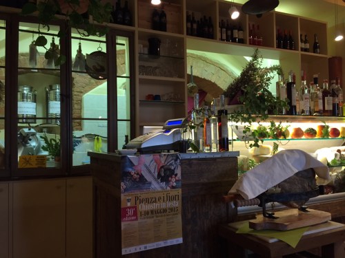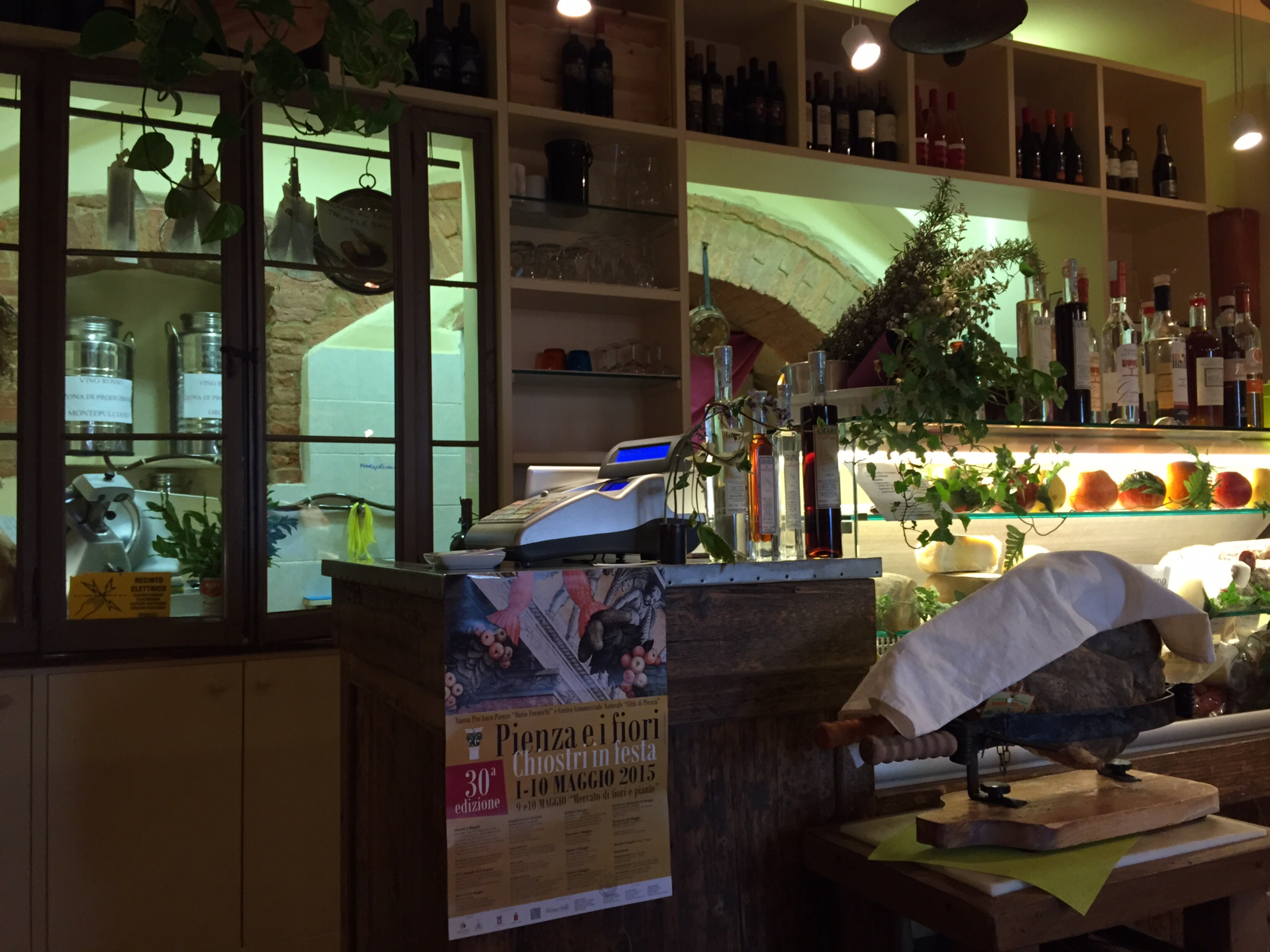 De huiswijn, logisch maar toch, komt hier uit de streek Montepulciano, en staat dus in een soort melkbus, verbonden met een veredelde tuinslang naar een tapkraantje in de keuken. Daar heb je hier geen flessen voor nodig. Op de foto links van de kassa.