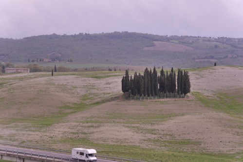 Nog even een foto van Torreniere, als afsluiter. Er zijn hier in de omgeving veel mooie plekjes. Sommige vind en zie je zelf, sommige hebben iets hulp nodig. De foto’s van de cypressen bij Torrenieri kun je met wisselende jaargetijden in veelvoud op het internet vinden. De plek zelf ligt vlak langs een drukke provinciale weg, een parkeerplaats is er niet echt, de meeste mensen, en het zijn er altijd wel een paar, zetten de auto gewoon stil langs de kant. Je moet je dan verplaatsen om er wat moois van te maken. Hieronder een foto waar toch wel uit blijkt dat het niet vanzelfsprekend een ‘mooie plek’ is.