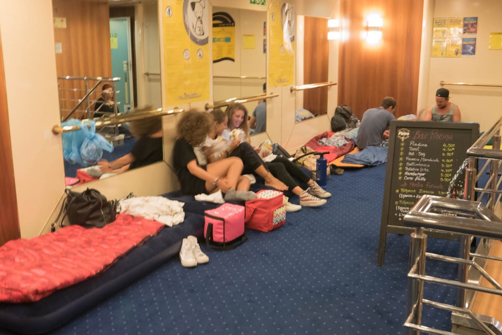 Ik ging gelijk op zoek naar mijn hut. Bij het oprijden van het terrein had ik en de auto een sticker gekeken. Op de sticker stond o.a. het hutnummer. Gelukkig had ik vrij snel mijn hut gevonden, een purser legde me e.e.a. uit. Dit keer een 2-persoonshut met uiteraard een eigen badkamer met douche, wastafel en toilet. Net zoals op de heenweg zie je overal mensen een plekje uitzoeken voor de nacht, tenminste de mensen die geen hut of slaapstoel gereserveerd/betaald hebben. Dat gaat best ver. In het trappenhuis hadden 3 meiden zelfs luchtbedden en een pomp meegenomen. Je hebt dan geen moment rust, maar met luchtbed slaapt het best lekker, neem ik aan.