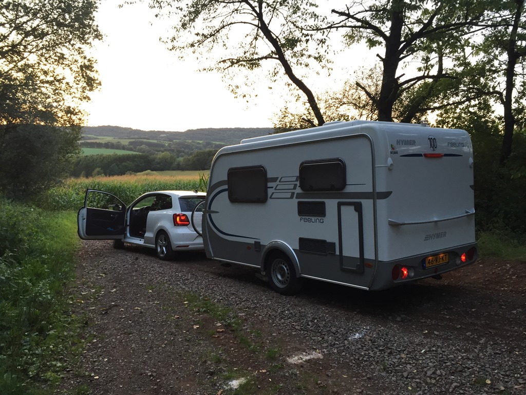 Dan sta je stil op een onverharde weg, helling. naar voren lukte niet meer, naar achteren de helling af,,,, zo’n 30 meter terug was een pad naar rechts, met de kennis van de cursus caravanrijden en de hulp van 2 extra ogen van C, lukte het me om met de de kont van de caravan dat pad in te rijden, en nadat dat deels gelukt was kregen we de auto met de caravan gekeerd.