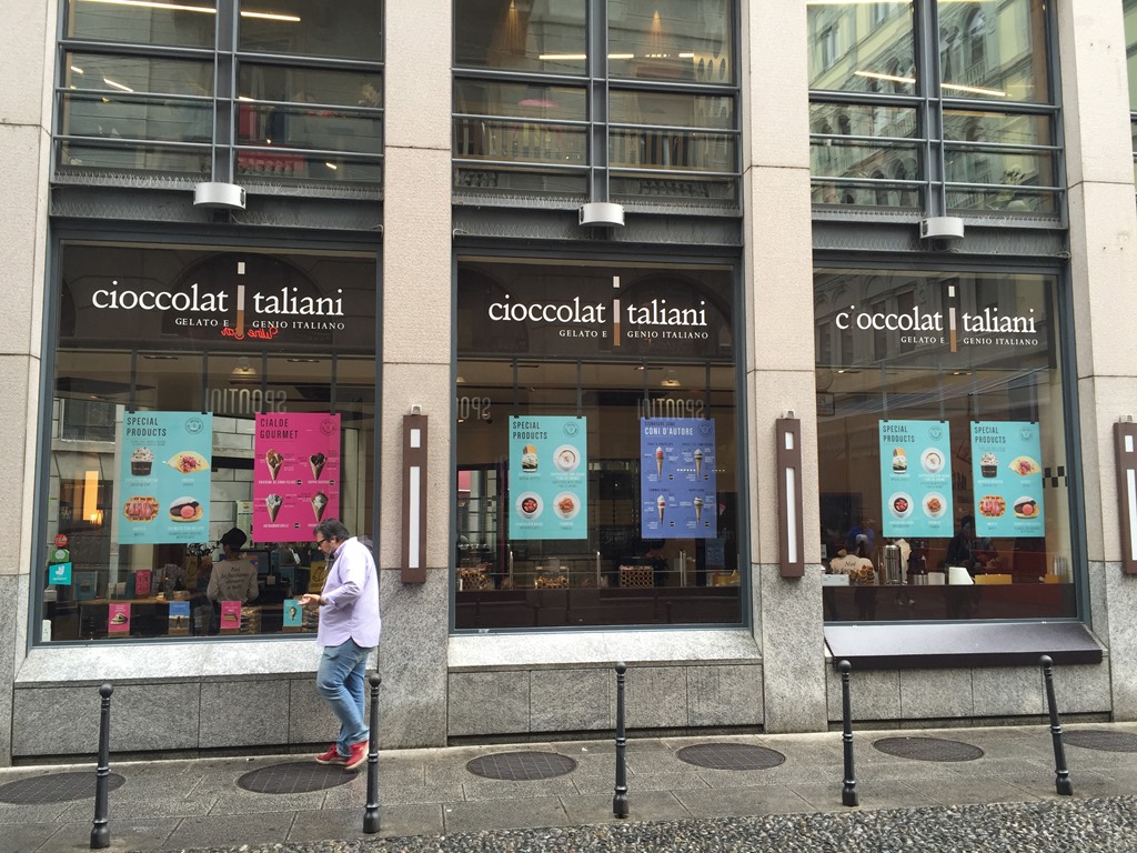 Erge mooie spullen, maar beetje onwerkelijk kwa prijs en smaak. Je moet echt wel geld hebben om deze smaak te hebben of zo. We liepen verder. Grote tenten bij de Ferrari winkel, dit weekend F1 in Monza, niet zo heel ver van Milaan. Veel vaders met zoontjes. Voor C was er verlichting bij McDonalds, Ernaast zat een hele mooie ijswinkel, Van een keten, ik heb er al meer gezien,