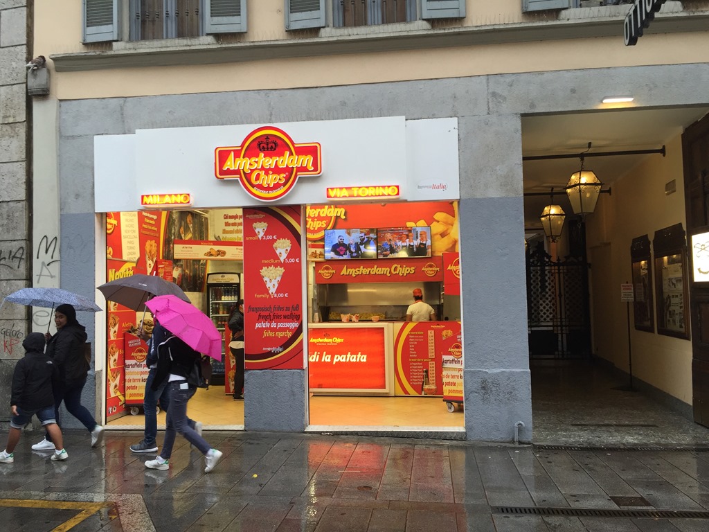 Halverwege was het tijd om wat warms te eten. Een focacio met wat groens erop en een wafeltje toe. Even binnen zitten en uit de regen. Vlak nadat we de via Torino verder inliepen zagen we wel een heel apart eettentje, voor italiaanse begrippen dan.