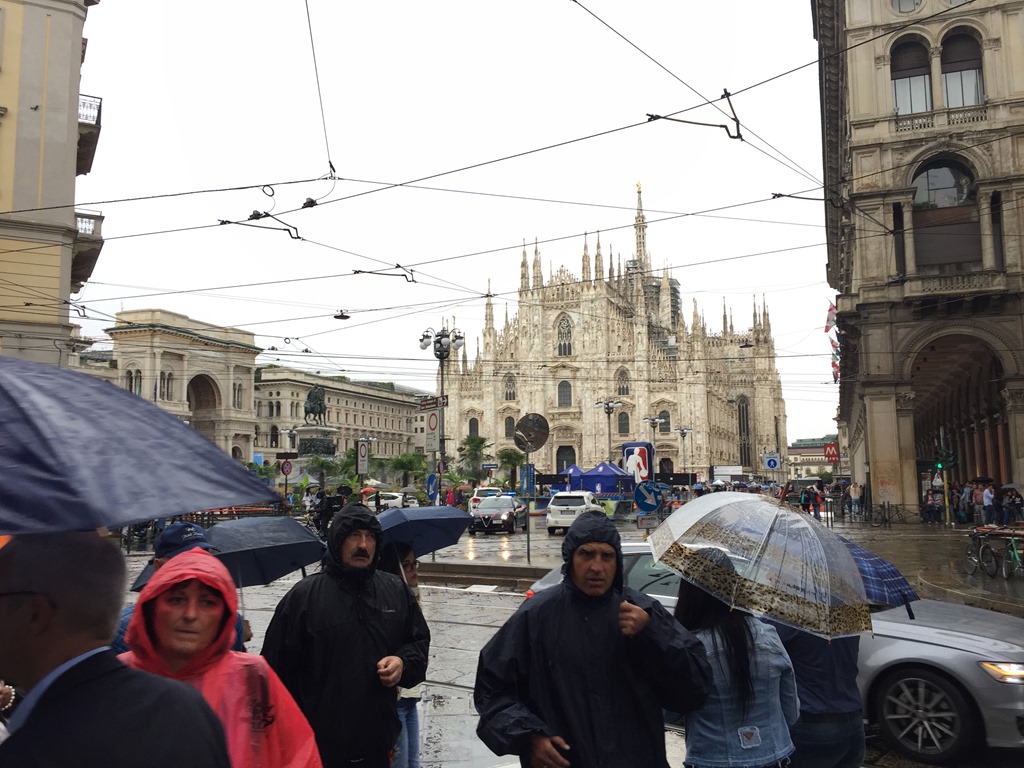 Niet veel later kwamen we bij de Duome boven de grond. Best wel druk, met erg veel paraplu-en. We liepen de grote overdekte hal in met winkels van Prada en Louis Vuitton. Mooie vitrines.