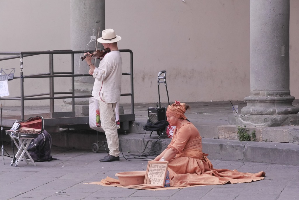 Tegen 7 uur vertrokken we opnieuw, op de fiets, naar Lucca. Bij de grote kerk, de Lorenzo kerk geloof ik, stalden we de fietsen. Oeps, alweer een trouwerij. Na dat aanschouwt te hebben liepen we via allerlei straatjes en winkels, die rond 8 uur dicht gingen, opnieuw naar het Amfitheator, om daar met een goed glas wijn (Chianti) te genieten van al wat op het plein langskwam, O.a. wat straatmuzikanten.
