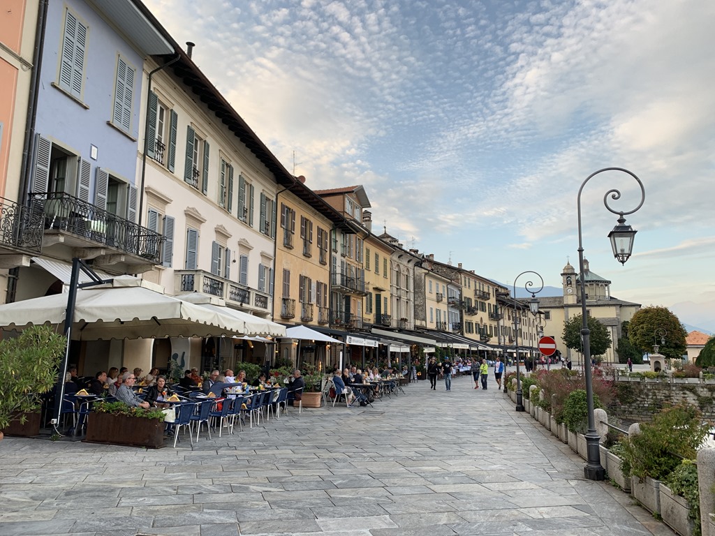 Dag 3, Zaterdag, alles was nog nat van de onverwachte regenbui van vannacht, Vooral de stoelen. Maar met de badlakens als zitting lukte het toch om buiten te ontbijten. Plan was om vandaag naar de markt in Verbania te gaan. Weersverwachting zo’n 24 graden. Dat was het bij het ontbijt nog niet, maar al vrij snel kwam de zon z’n best doen. Rond 10 uur vertrokken we op de fiets, zo’n 19 km, naar Verbania. Het verkeer was genadig, en met een lekker gangetje gingen we onderweg.
