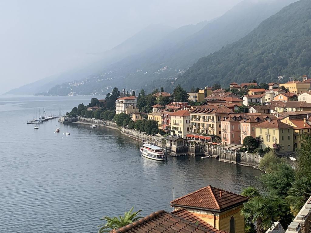 Rond 3 uur liepen we de, nu lege, boulevard nog eens langs om het beginpunt van onze wandeling, morgen, naar Cannero Riviera te zoeken. Dat lukte half, met de hulp van nederlanders op de camping en het scherpe oog van C kwamen we er uit en zijn we van plan dat morgen te gaan wandelen. Er zit een vrij scherp verloop in de wandeling, we starten op 200 meter hoogte en lopen vrij snel naar 500 meter, vandaar weer terug naar 200, en in Cannero Riviera hopen we dan de bus weer terug te nemen. Wordt hier morgen 26 graden, dus we vertrekken bijtijds, om de ‘hitte’ een beetje voor te zijn. Hier vast een voorproefje van een uitzicht.