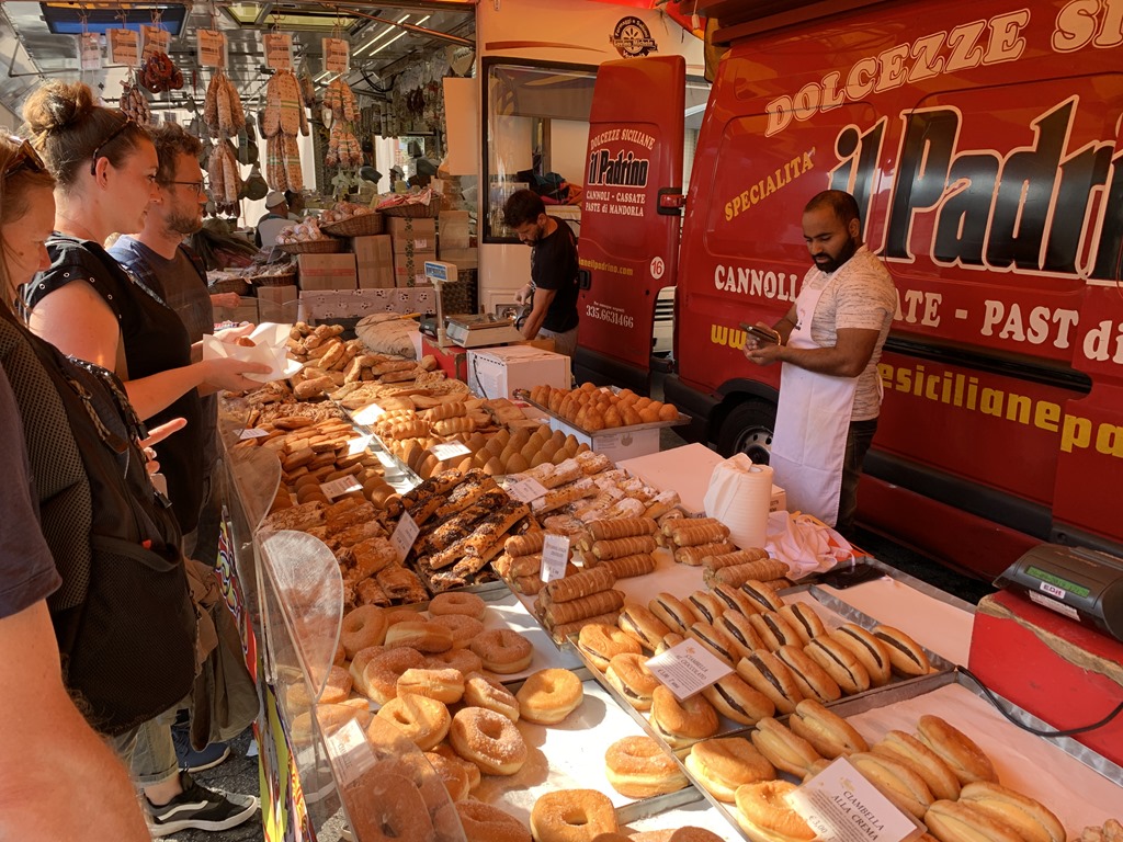 Brood en gebak (Dolce) waren uiteraard ook ruimschoots aanwezig. Een dikke 2 uur hebben we over de markt geslenterd, gepast, gesnoept en weer gepast. Tot wanhoop van sommige marktkoopmannen soms. Maar ja, we blijven hollanders, kijken kijken niet (altijd) kopen.