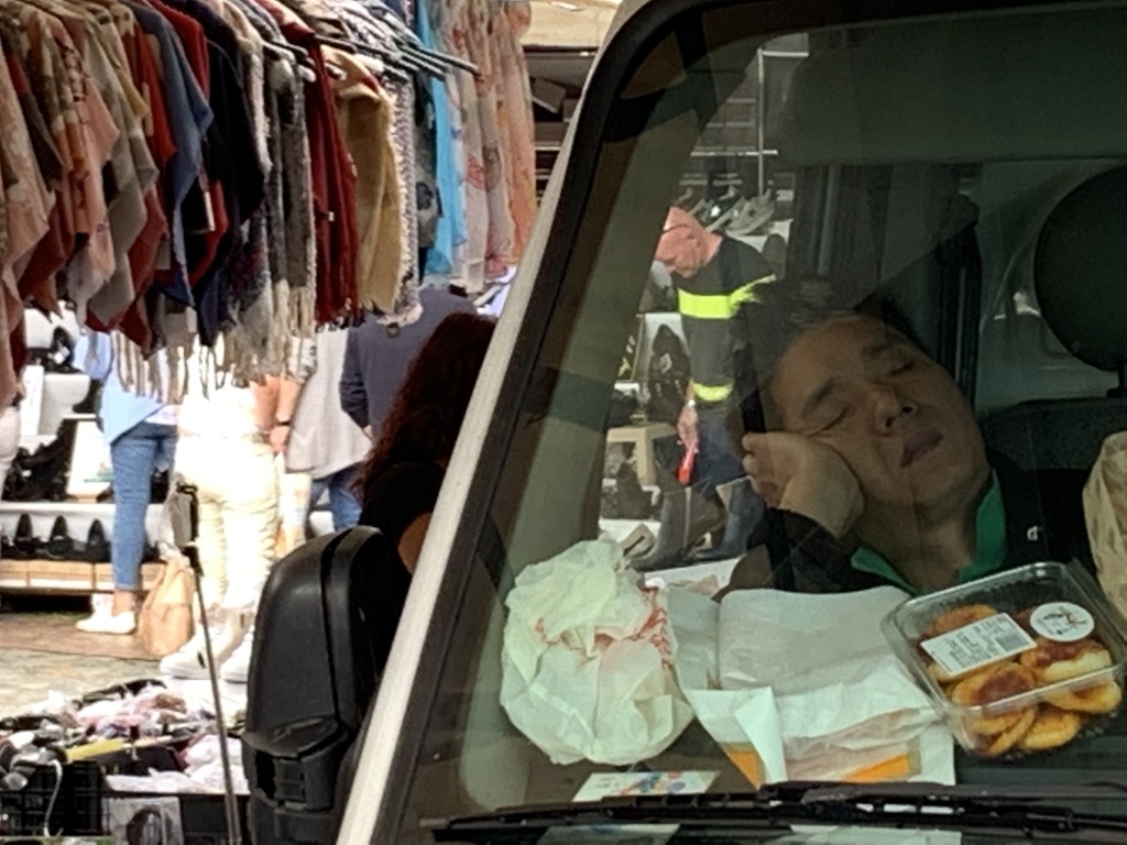 Het was best weer vermoeiend het slenteren, het treuzelen, het zoeken naar de juiste maat, kleur en prijs. Maar het was niet alleen voor ons vermoeiend, bleek: