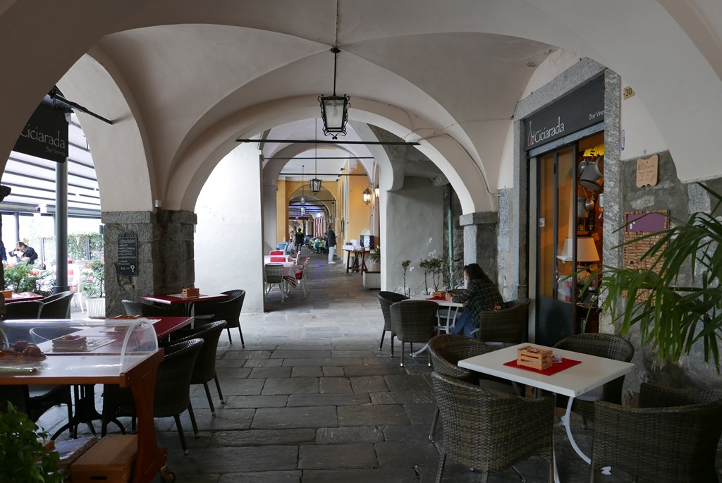 Achter de terrassen, overdekt, lagen de eerste winkels. Veel kleding, dus C was wel even bezig. De gebouwen zijn best apart, zal wel specifiek voor dit gebied zijn, Beetje duits met italiaans sausje, zeg ik als leek.