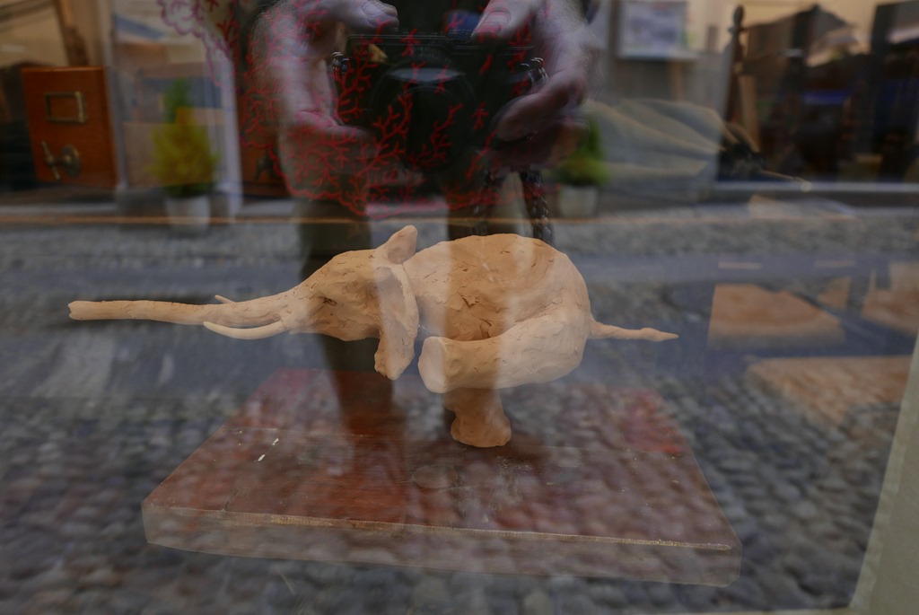 In één van de winkels zagen we deze olifant, van klei, in een apart standje, soort handstand, of vliegende start. Net na 12 uur begon het een beetje te druppelen. Het zou vanmiddag meer gaan regenen en in de avond word onweer verwacht. Dus we besloten terug te fietsen. Dat ging voorspoedig. Daar het steeds meer begon te druppelen besloten we de grenzen, qua snelheid, van de e-bikes op te zoeken. Met een flinke snelheid reden we Zwitserland weer uit en Italië weer in. Tijd voor lunch, de rest van het verse brood werd tot de laatste kruimel verorbert.