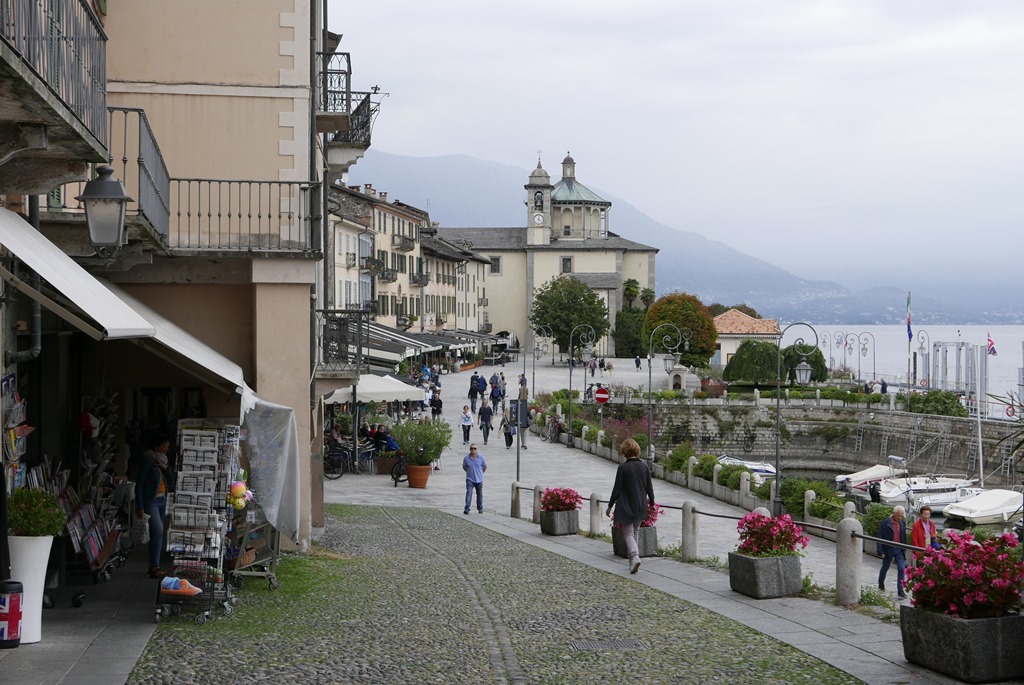 Nadat we ontbeten hebben zijn we nog even bezig over wordt het de auto of de fiets. Locarno is 17 km ver, dus best wel te doen, met de auto of de fiets. Het wordt de fiets. Het ziet er wel al wat ongezellig bewolkt uit, maar iets na half 10 stappen we op de fiets; Nog voor de grens met Zwitserland moeten we even wachten. Een bus en een vrachtwagen kunnen elkaar niet passeren. Het duurt even voor de vachtwagen het oplost door wat achteruit te rijden.