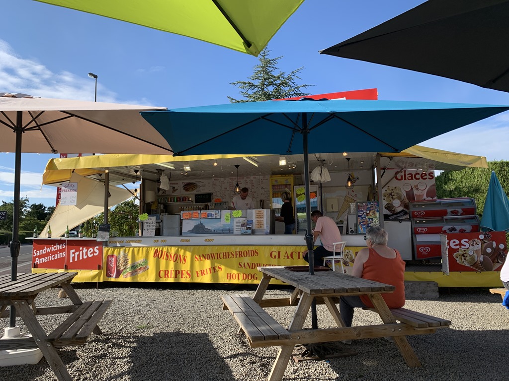 Een middel friet met (zure franse) mayo, cola en voor mij een ‘hot dog’, en de maagjes zitten weer even vol.