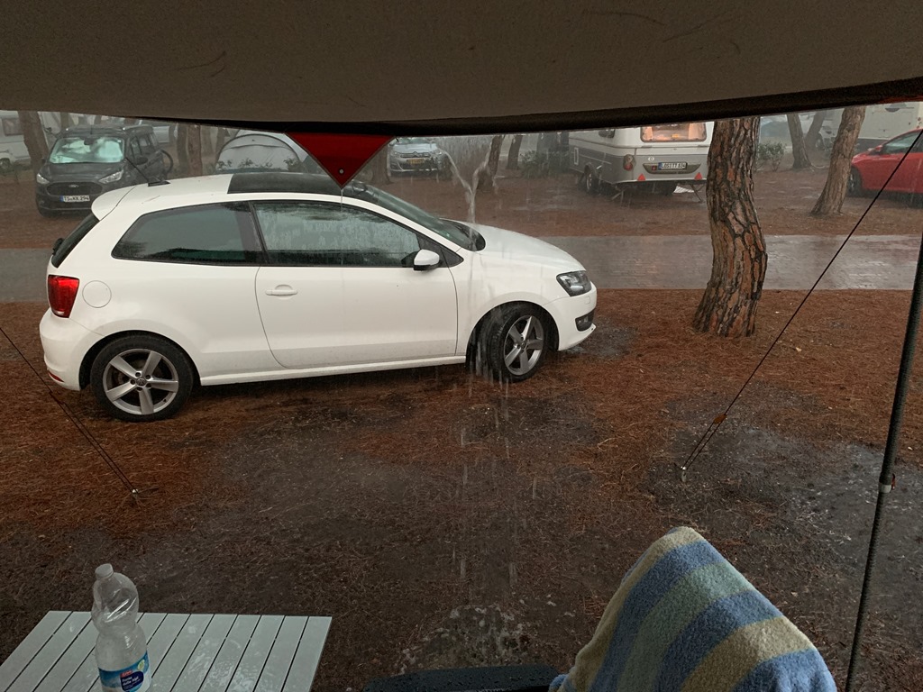 Bammmm, met een knal werden we om ongeveer 7 uur gewekt, en meerder knallen. Onweer, en regen, en niet zo’n beetje ook. Gelukkig is de caravan er op berekend, hadden we de meeste handdoeken gisteravond al in de auto gelegd, de stoelen werden iets nat. Maar daar valt mee te leven. De directe naaste buren, auto met tentje en al hun handdoeken aan een lijntje, hadden minder geluk. Een hollands koppel aan de andere kant van het pad, zagen hun tent omringt met water, toen ze deze openden. Ja, als het valt, dan valt het met bakken.