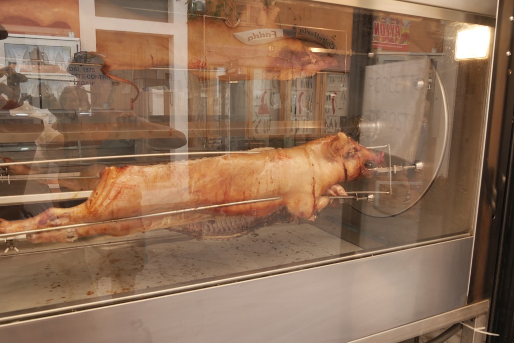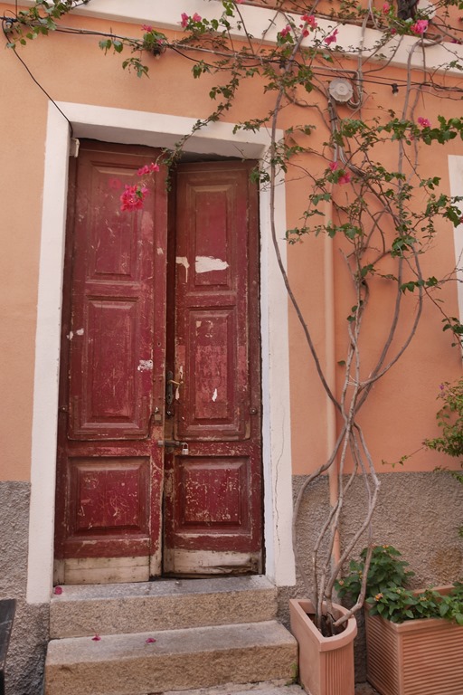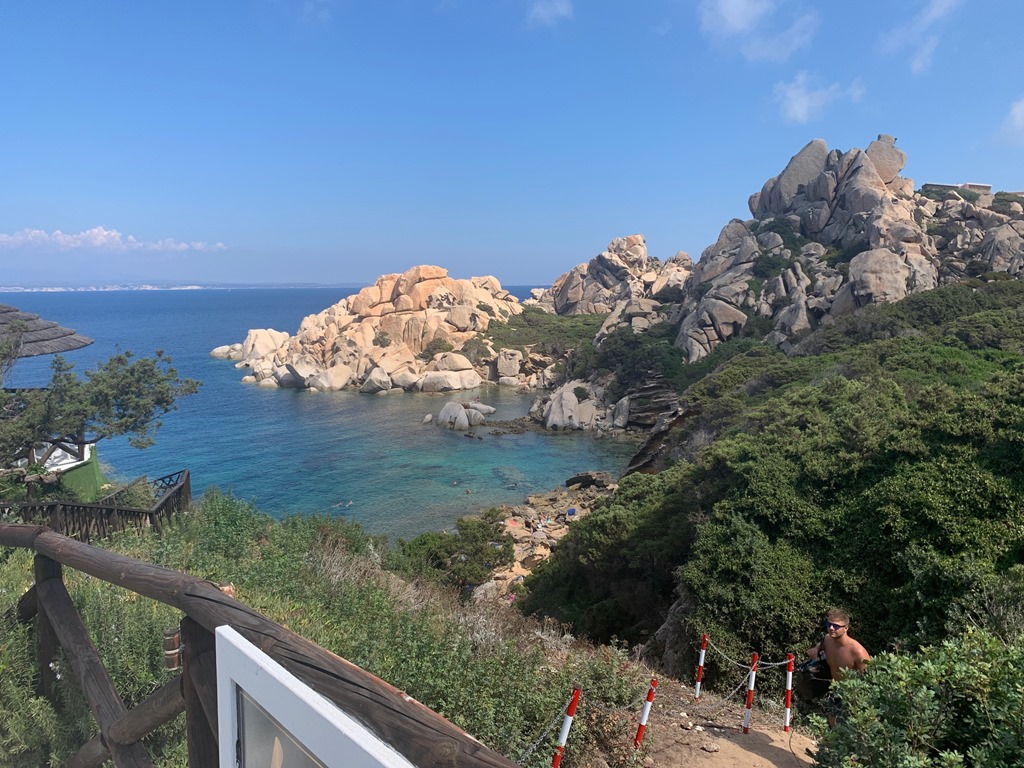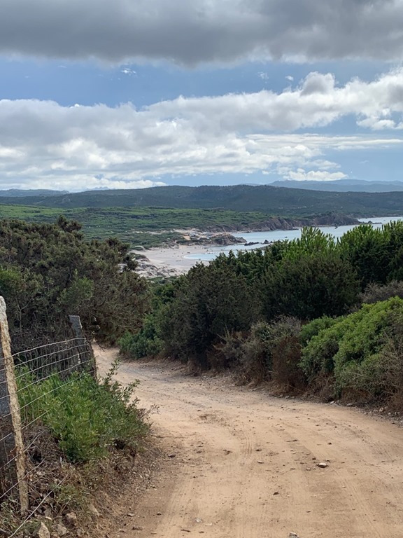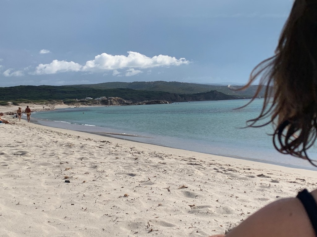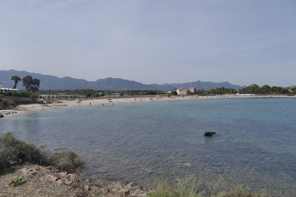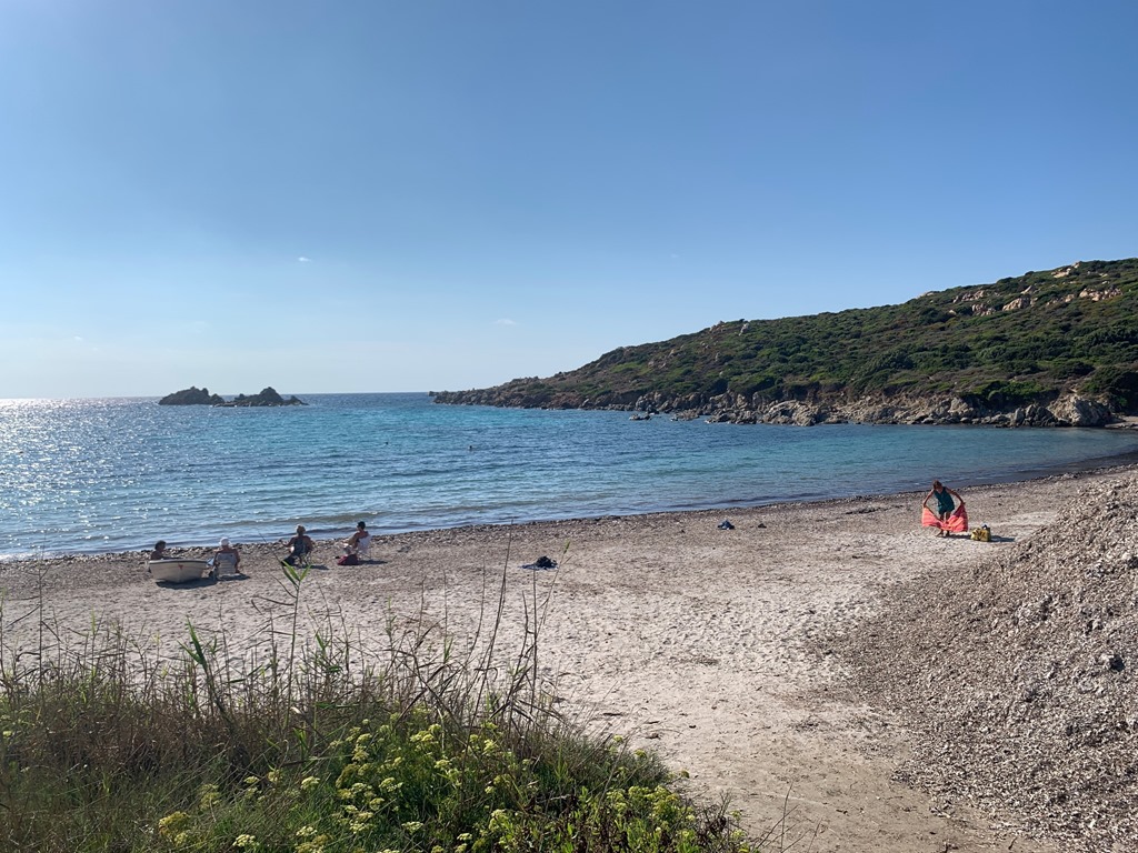 8 uur broodjes halen, 9 uur op weg naar hetzelfde strand van gistermiddag, bij Ghia, Su Giudeu. Na het parkeren liepen we naar ongeveer dezelfde plek als gister, de strandtent is een richtpunt om door de zee naar de 2 eilandjes te kunnen lopen.