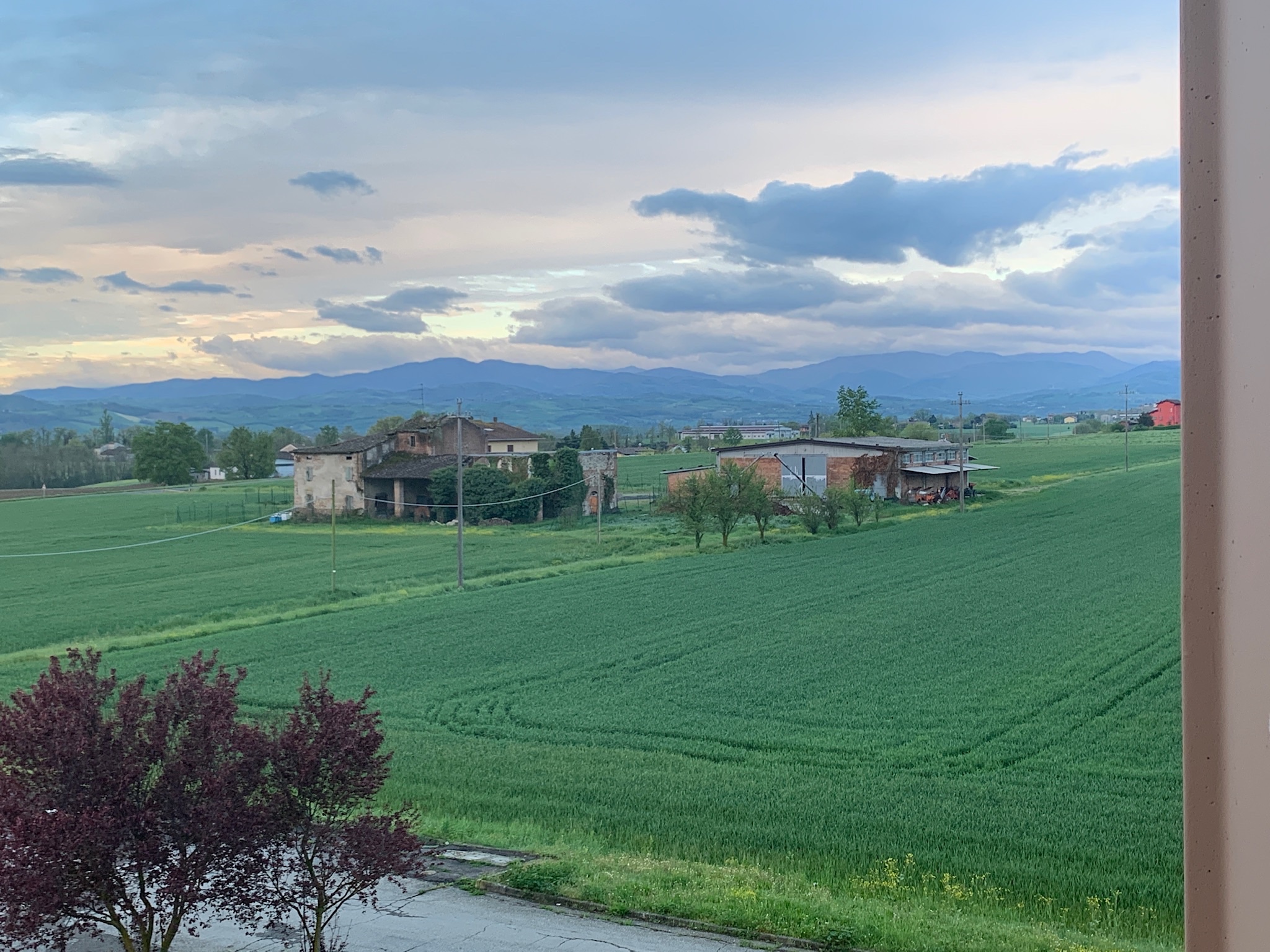 Ook nog even een blik geworpen van waar ik nu eigenlijk was, italiaanse platte land met de bergen, Appenijnen of zo, op de achtergrond, een voorzichtig zonnetje luid de dag in.