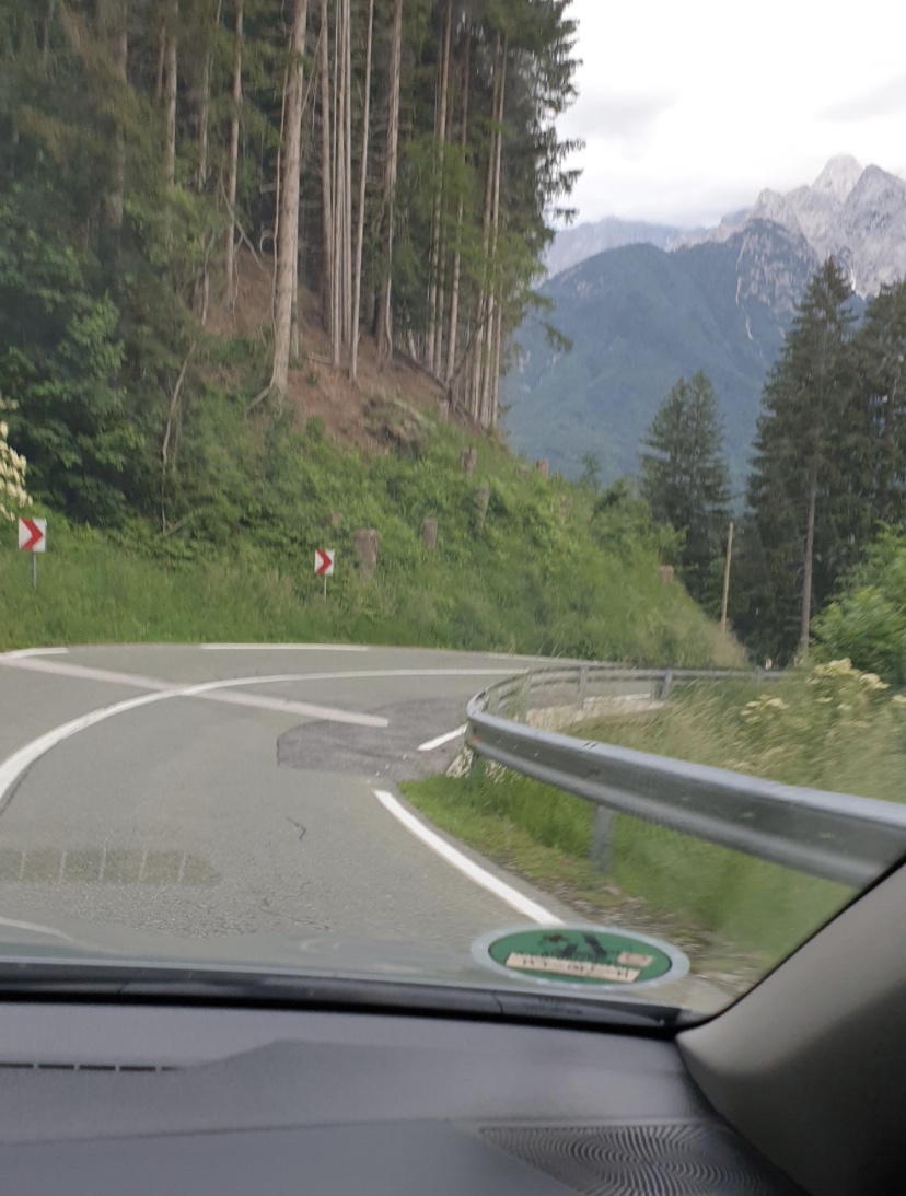 Maar het lukte, eigenlijk best wel aardig. Toen, na nog een bocht, de grensovergang met Slovenië, en daar reed de politiewagen die we eerder zagen net van weg. De douanier zwaaide hem met een lachend gezicht uit. En gebaarde ons te stoppen.