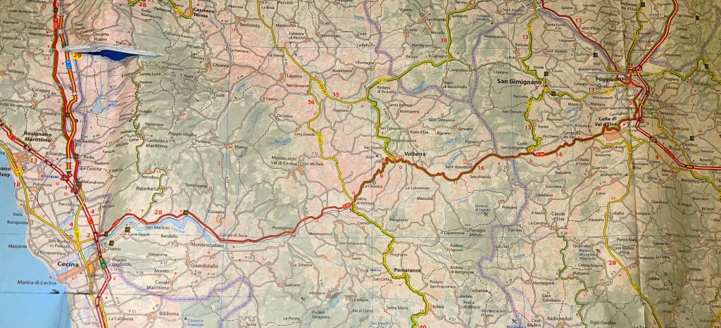 Links onder, bij de kust, Cecina. De rode weg loopt van links naar rechts (Colle Di Val D’Elsa). Bij Volterra, midden van de kaart, loopt een groene weg, met een boog naar (boven en dan naar) rechts, naar San Gimignano. En van daar door naar Colle… De rode weg is ook deels groen. Kortom, mooi. Teveel indrukken om op de foto te zetten. Landschapfoto’s in de blog, doen het minder, vind ik.