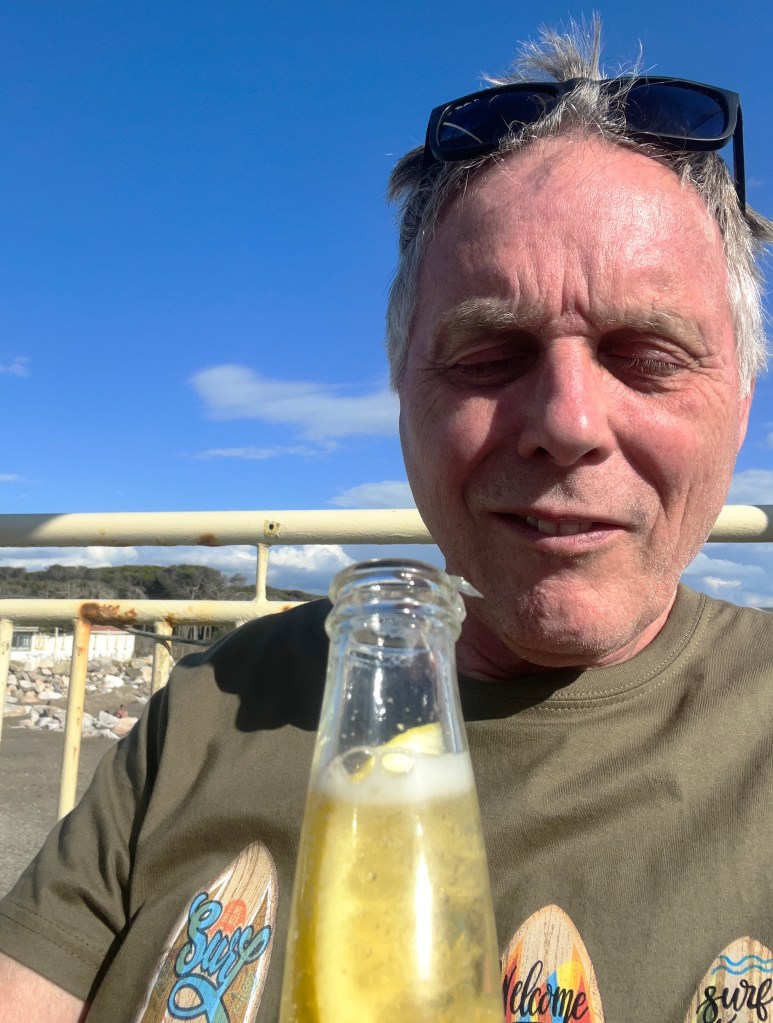 Bij het hotel verklede ik me en liep nog wat langs het strand. Nog wat drinken bij een grotere Conad gehaald. En toen een biertje genomen bij het ’cafe’ tegenover het hotel. De zon straalde aardig in.