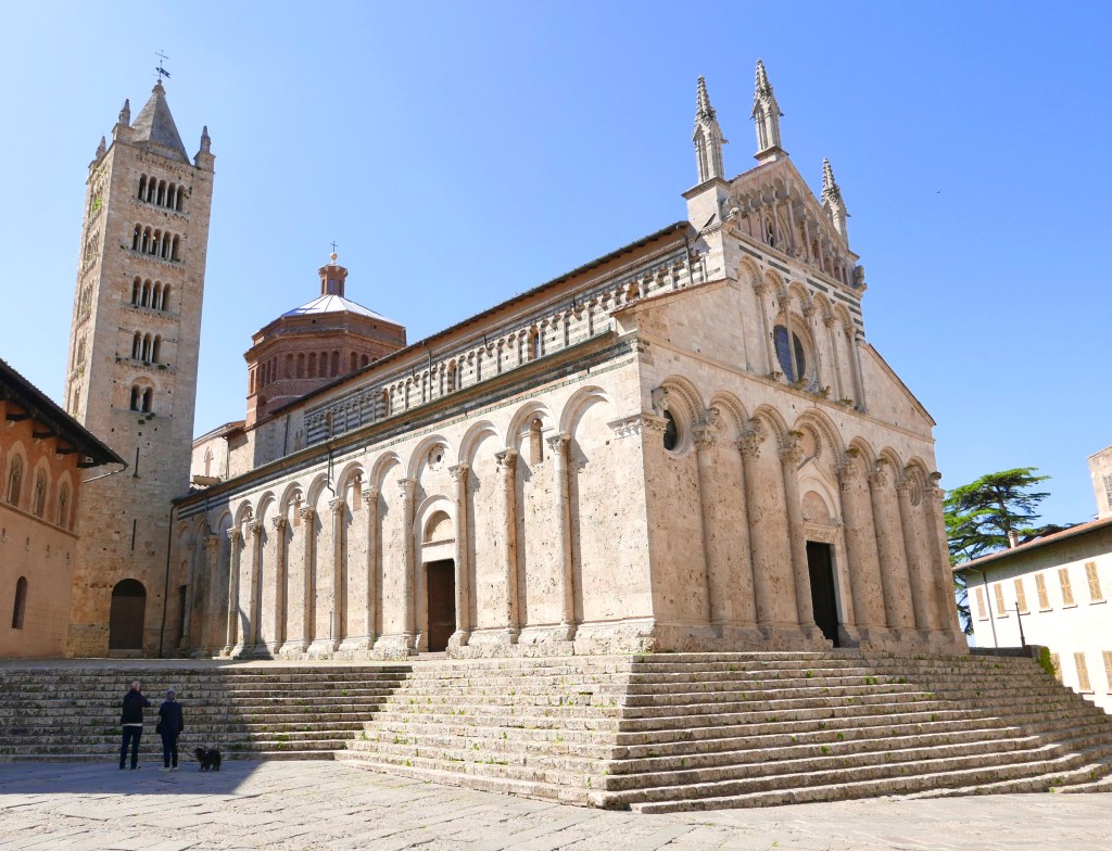 Maar eerst rijden. De max snelheid op de groene weg blijkt 50 Km/h te zijn. Wat al iets zegt. Via de groene route kost het bijna 2 keer zoveel tijd als via de snelweg. 1:45 ipv net geen uur. Wat ook wat zegt. Via een opnieuw inspannende route van bochten, S-bochten, omhoog, omlaag, kreeg ik een mooie rit aangeboden. Deels door bossen, nog een paar stadjes met hele lange namen (zoals Castelnuovo Di Val Di Cecina). En uiteraard ook mooie vergezichten. TomTom bracht me tot in het centrum van MM. en er waren gelukkig parkeervakken voor brommers en motoren. Na alles opgeborgen en op slot te hebben, liep ik het hoekje om en zag de Duomo van MM. daar zijn ze al een tijdje best trots op.
