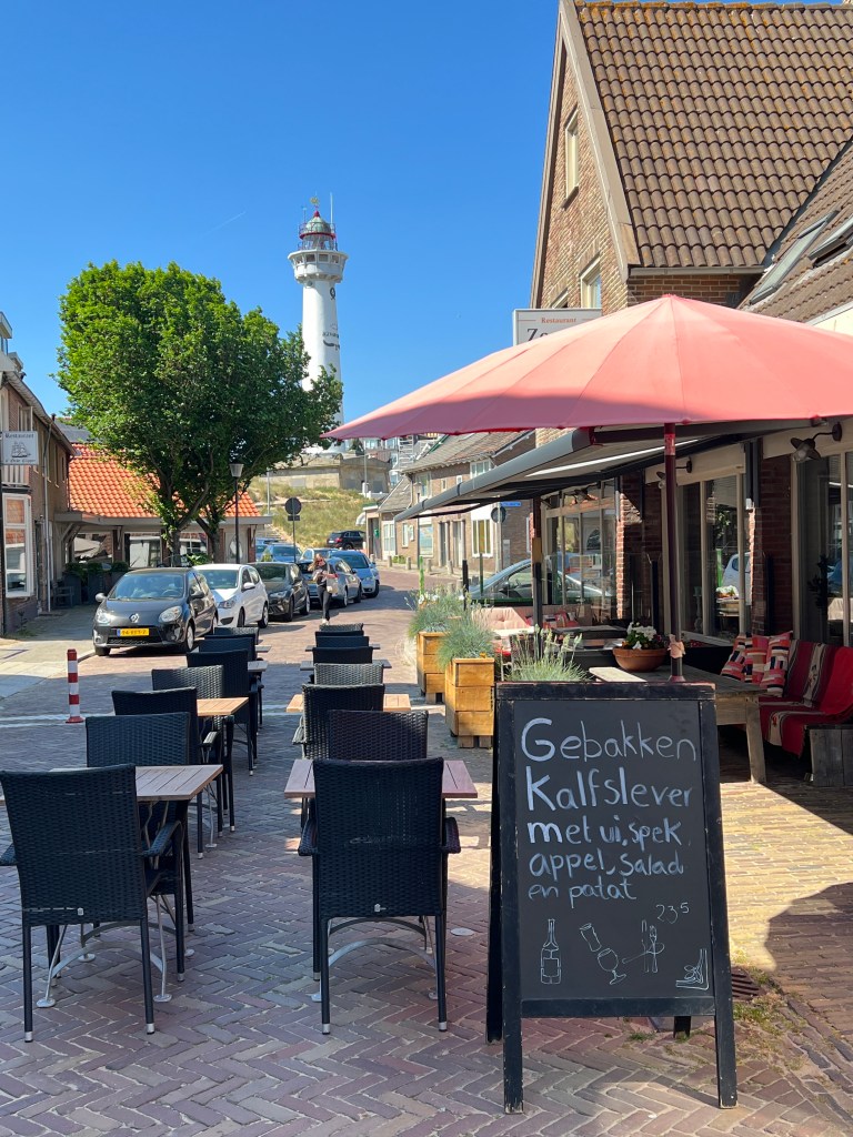 Na even de drukte tot ons genomen te hebben, besloten we een drankje te doen. Bij een strandtent vonden we een plekje met zicht op de meute. Ik een Corona en C een Liefmans. Die verdampte snel, het was bloedheet. Na het drankje vluchten we weer naar buiten, waar een windje nog enige verkoeling gaf. Via de winkelstraat weer richting de fietsen.