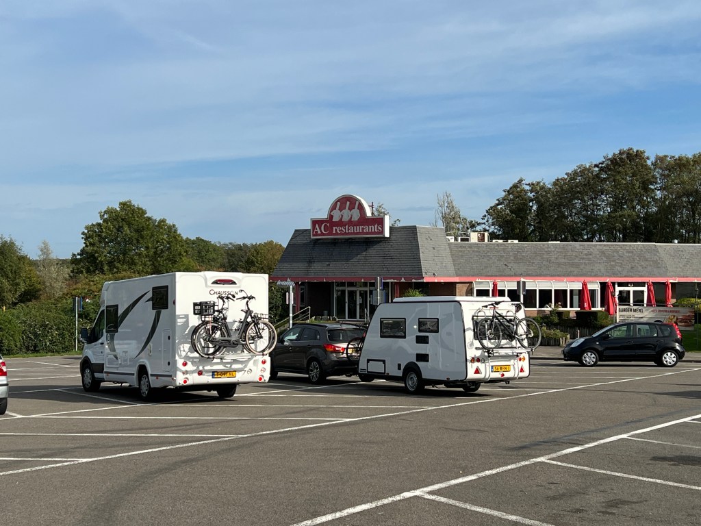 Ontbijten en daarna de fietsen op het rek. Kwart voor negen, na lozen grijs water, en de binnenkant van de voorruit (condens) drogen, vertrokken we. Eerst naar het tankstation, goedkoopste m.b.v. ANWB app, en daarna de snelweg op.
