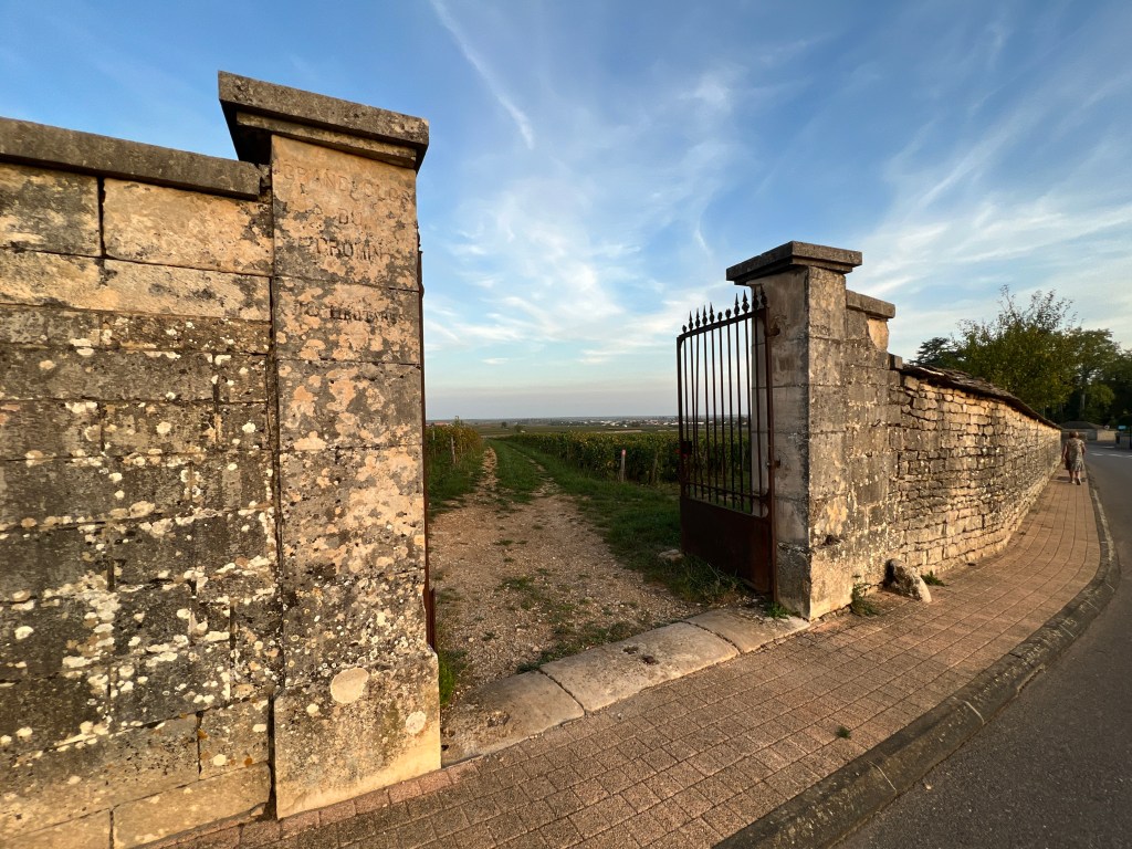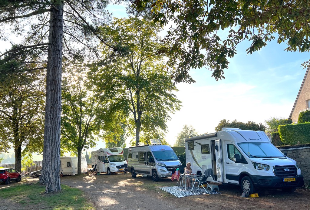 250 Km is niet al te ver, we moeten na 14 uur aankomen, eerder zijn de plaatsen nog niet beschikbaar. Rond 1 uur aten we ons stokbrood op, tussen 2 vrachtwagens geparkeerd. 10 over 2 kwamen we aan op de Huttopia Camping bij Meursault. Er waren nog een paar plaatsen. Met een beetje schuiven, de nummers en de feitelijke plaatsen waren niet erg duidelijk, hadden we een plaatsje. Tussen de bomen door zie je overal druiven planten.