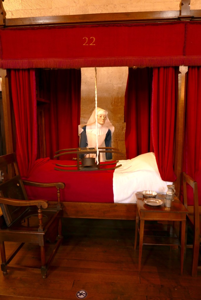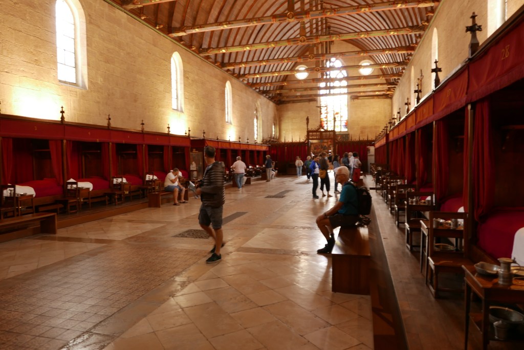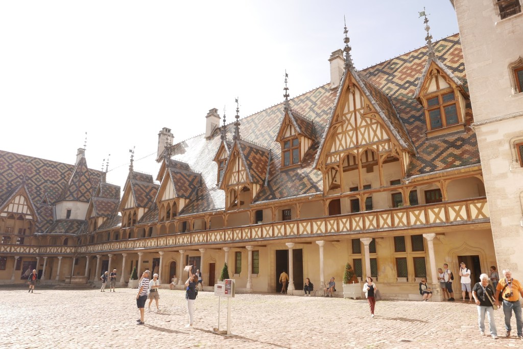 De zon begon al aardig warm te worden, via Volnay en Pommard reden we, de fiets bordjes volgend, naar Beaune. Het eerste doel was de Hospices de Beaune oftewel het armen hospitaal, opgericht al in 1443. Even zoeken met Map’s.Me, en we konden bijna voor de deur de fietsen op slot zetten.