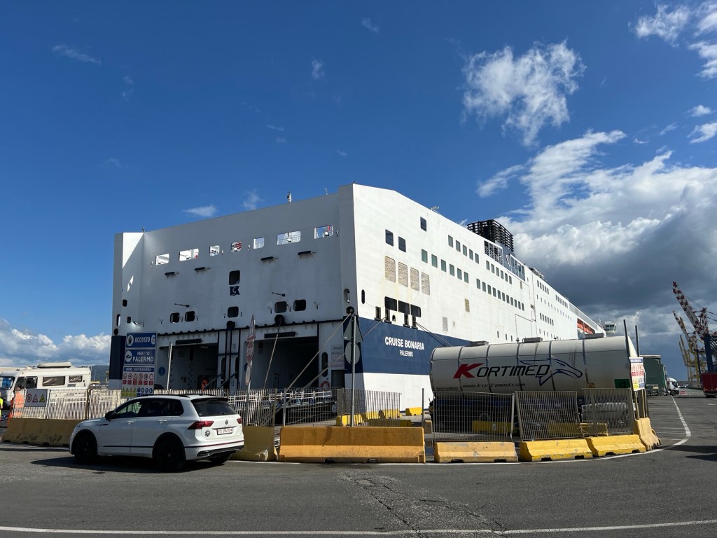 Net voorbij Parma even van de weg af om tegen een normale prijs te tanken. Met meer geluk dan wijsheid het hek gevonden om het haventerrein op de juiste plaats te vinden. Adres van rederij en TomTom was niet helemaal correct. Gelukkig stonden er ook borden, Grimaldi, Palermo, en daar was het.