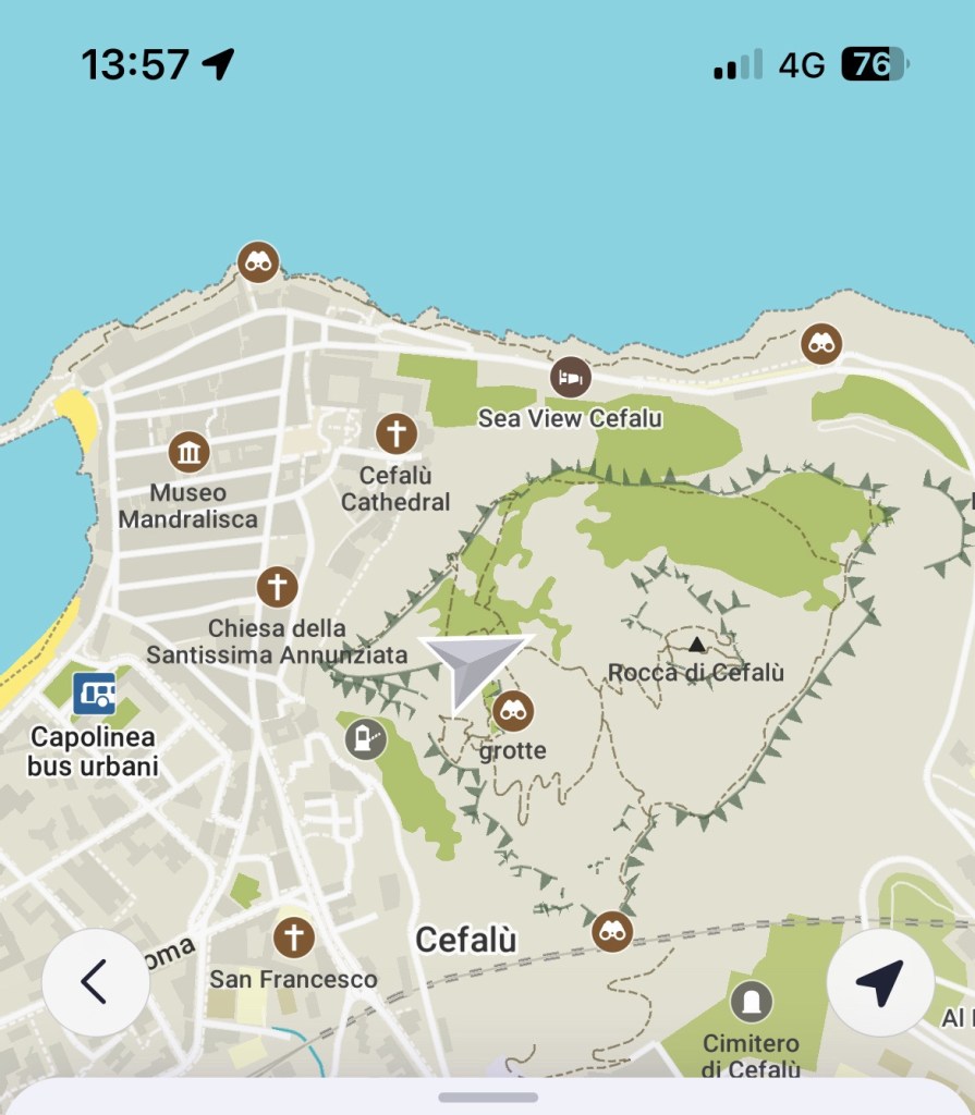 Op zo’n 200 meter hoogte was een soort balkon/terras, met een groot kruis, om ‘s-nachts te verlichten. En een mooi uitzicht over het oude deel van Cefalù.