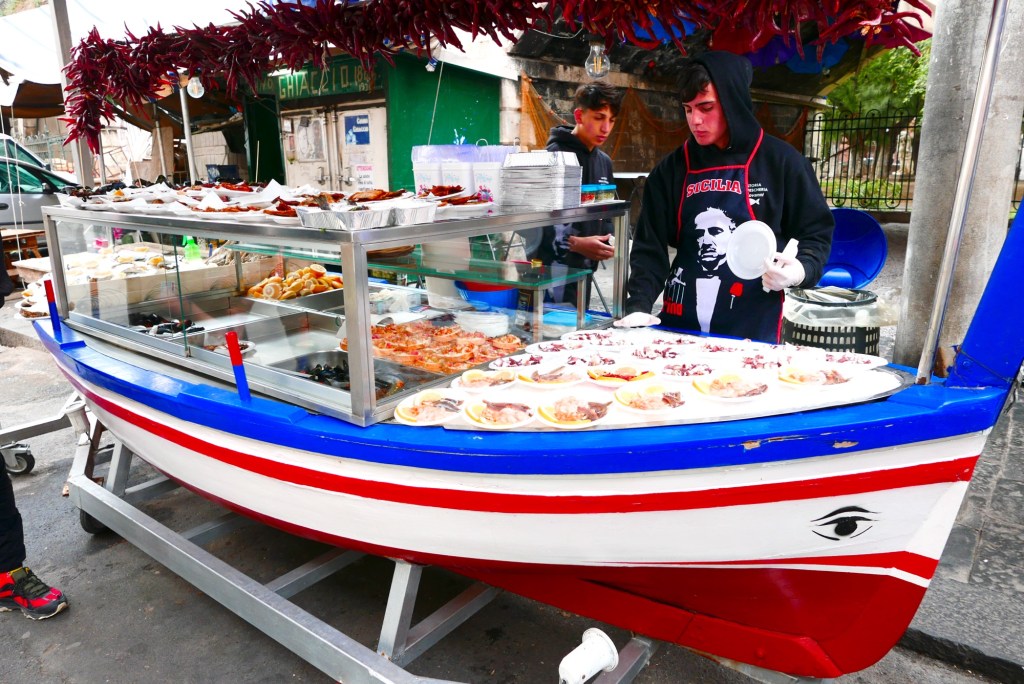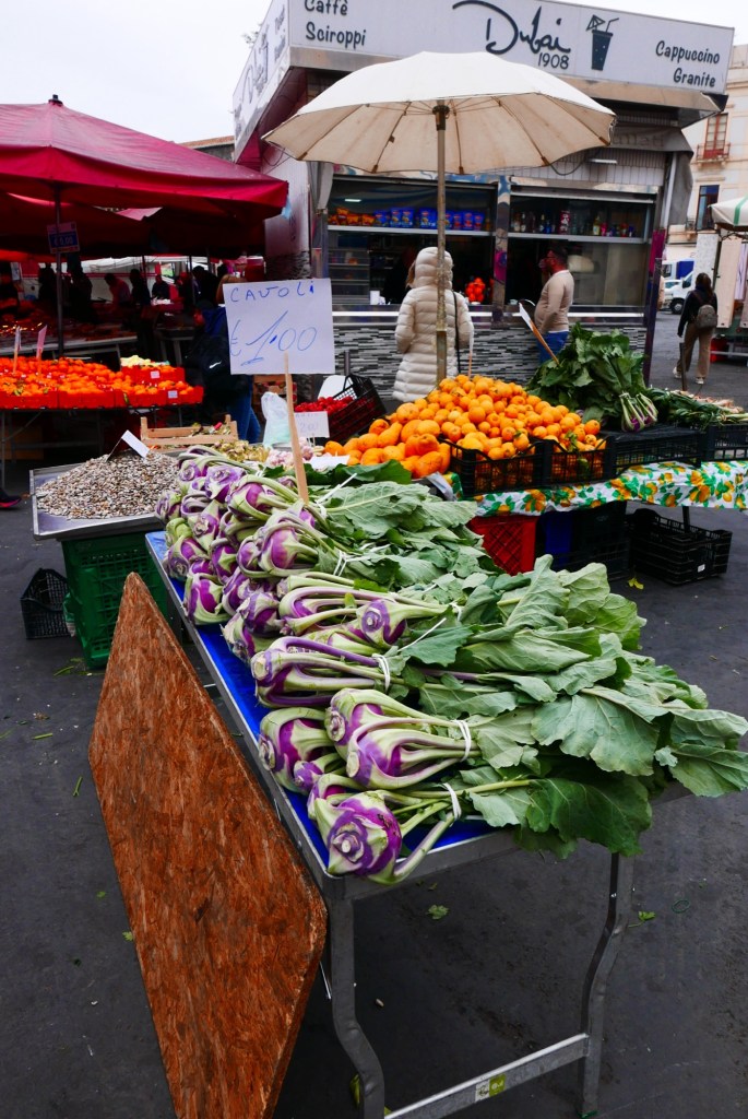 Douchen, ontbijten, water weer bijvullen en lopend naar de stad. Via Borsellino vonden we onze weg naar de ‘vis’markt. Iets kleinere schaal dan in Palermo. Maar ook iets minder toeristisch. We liepen een rondje, naast vis ook groente en fruit.