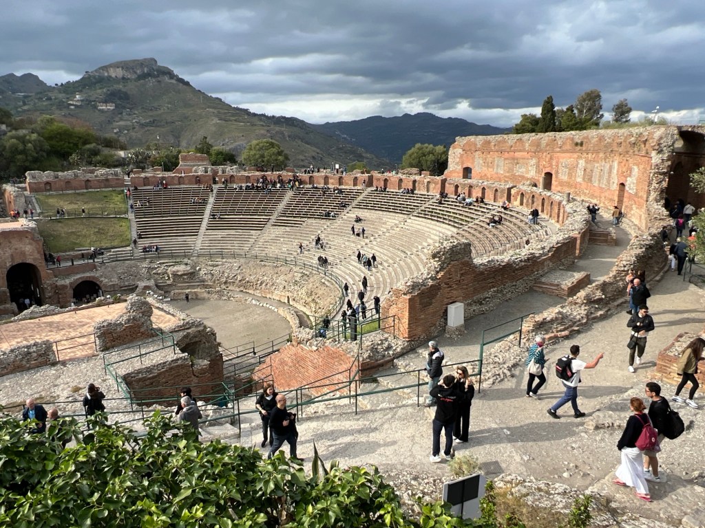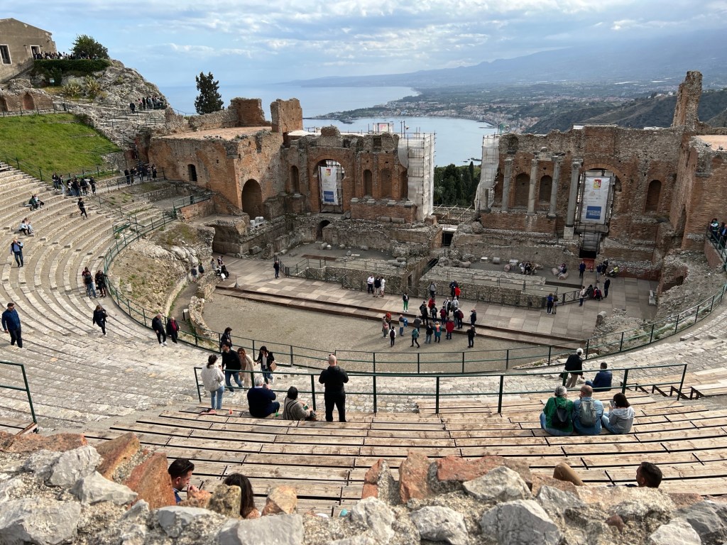 Binnen een kwartiertje zaten we hier in de shuttlebus naar hartje Taormina. Het beroemde amfitheater was vandaag ook gratis.