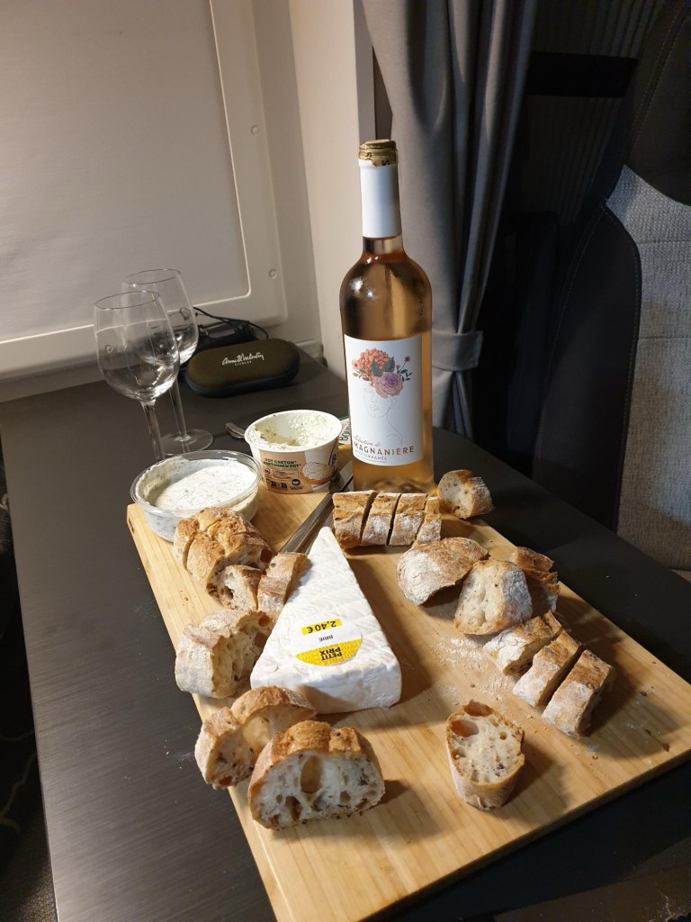 De burcht zit vol met souvenirs winkels, ambachten terrasjes etc. We lopen wat rond, drinken een koffie en warme chocolademelk, zoeken met Google maps naar de bakker en kopen 2x banquette au cereals. Voor de lunch en voor morgen. Zo tegen 12en besluiten we te gaan lunchen in de camper, het eerste stokbrood gaat schoon op.