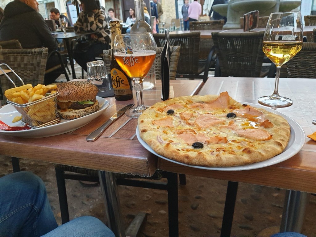 Tegen 5 uur gaan we weer terug naar de Cité. Kijken of we wat kunnen eten. Op hetzelfde terras als eerder koffie etc, gaan we voor een zalmpizza en cheeseburger. Wit wijntje en een Leffe Blonde maken het af.